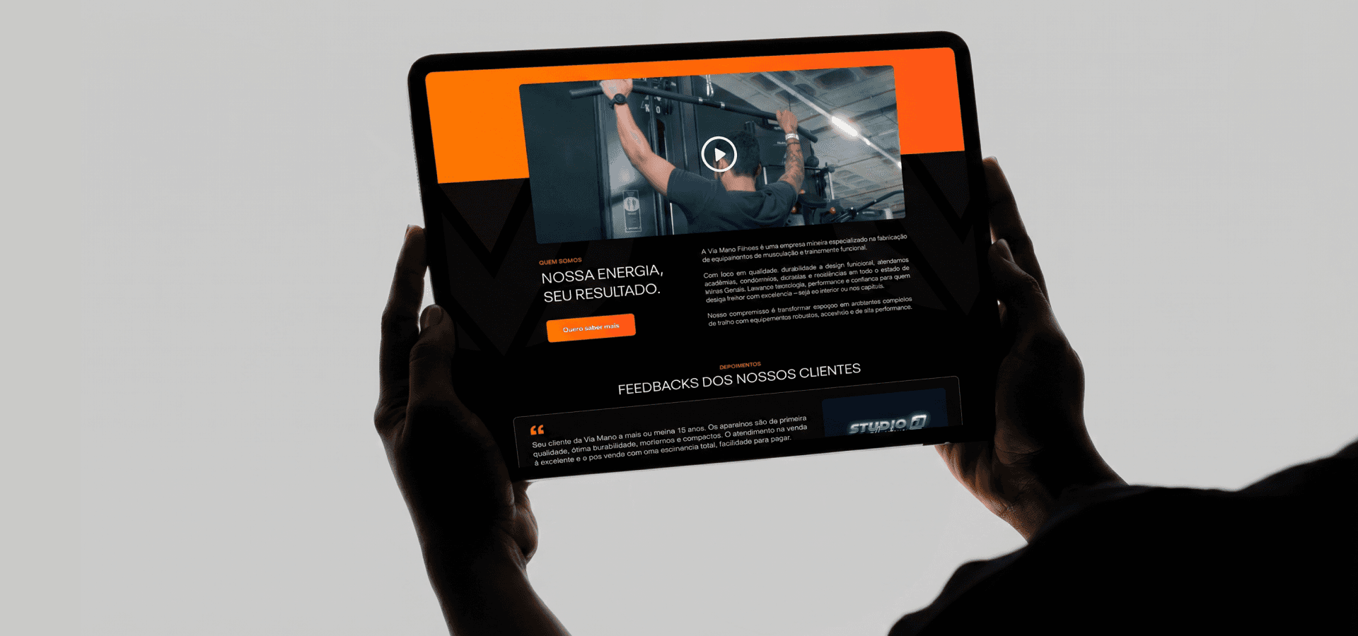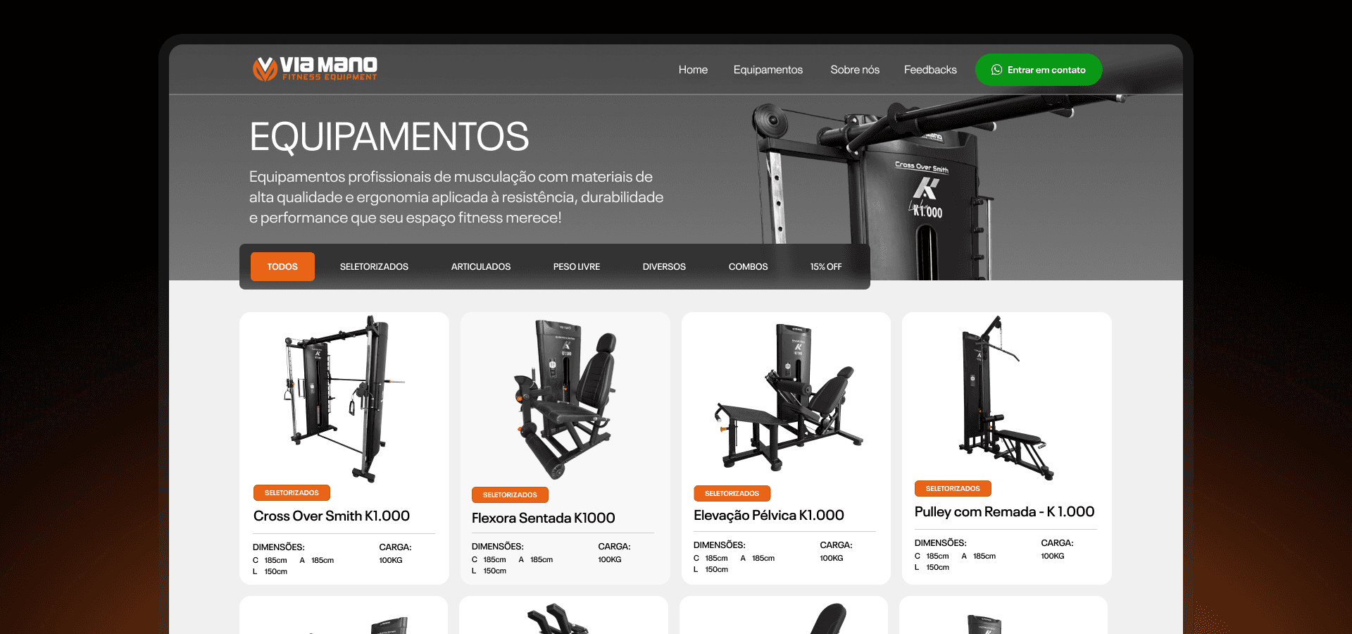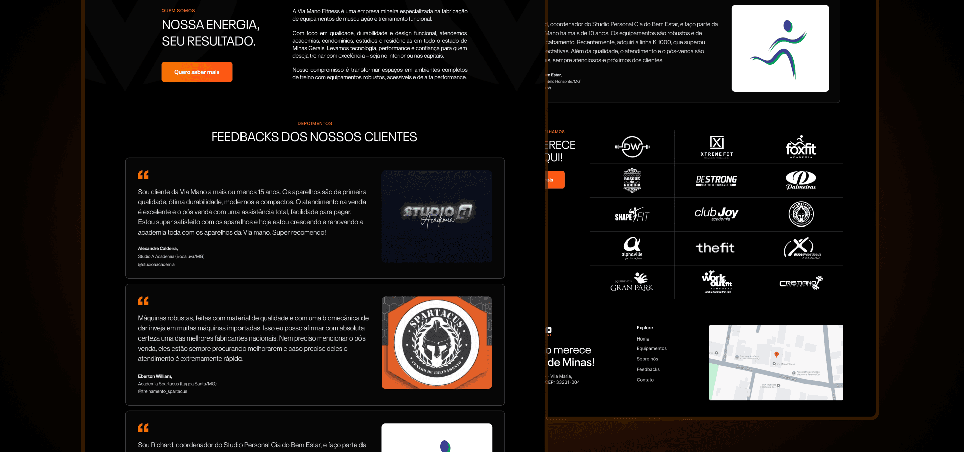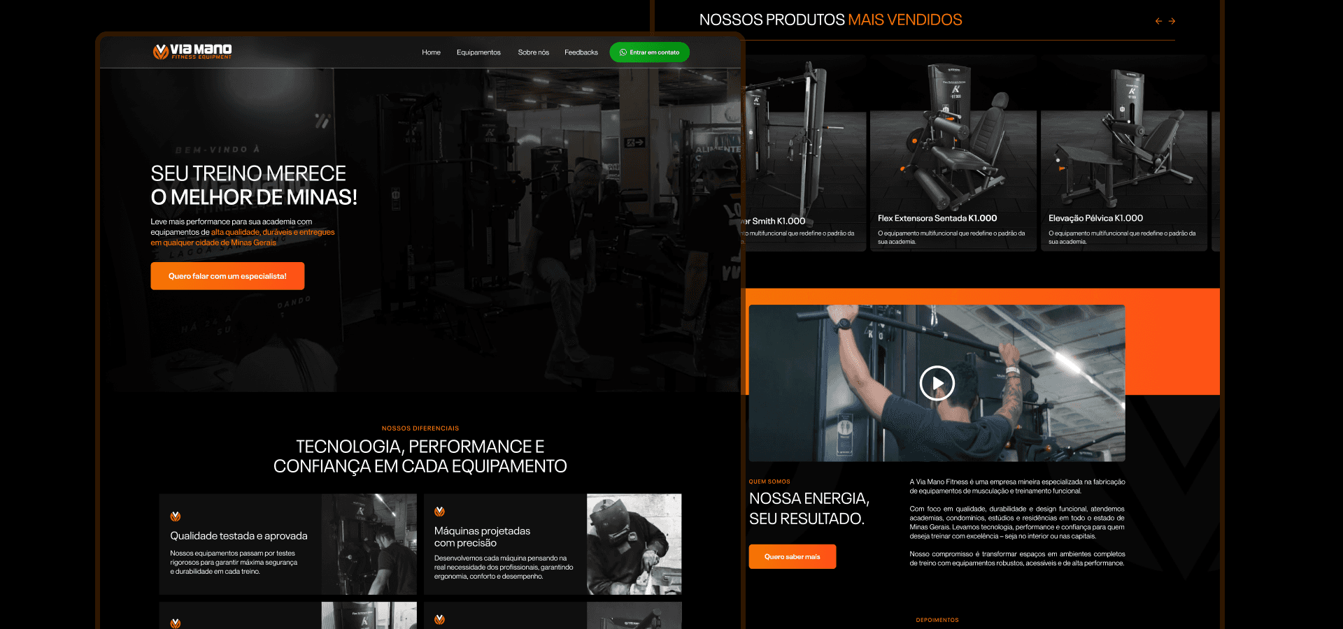 Via Mano Fitness, a manufacturer of weight training equipment from Minas Gerais. The project was designed to be a complete digital showcase, bringing together in one place the company's identity, product line with technical information, testimonials and differentiators, all aimed at lead generation.